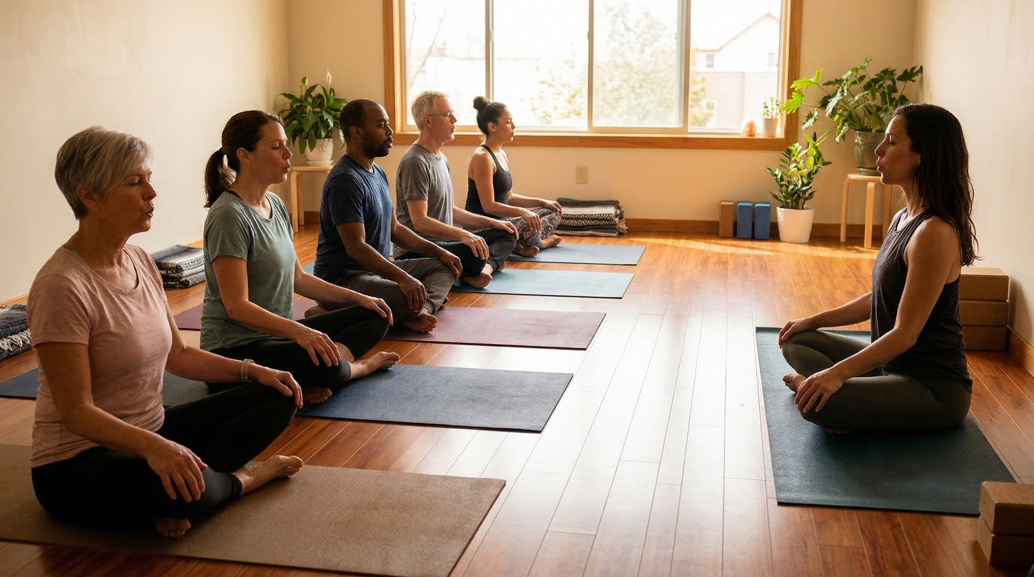 Yoga doesn’t require getting up and down from the floor or holding difficult poses. Many yoga styles focus on breath awareness and gentle mobility.